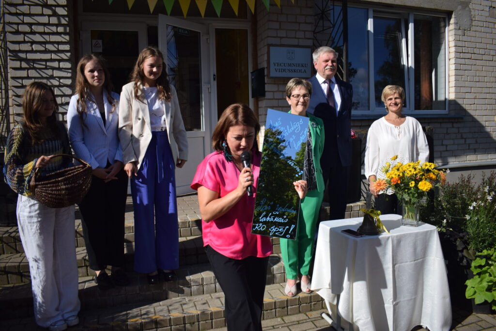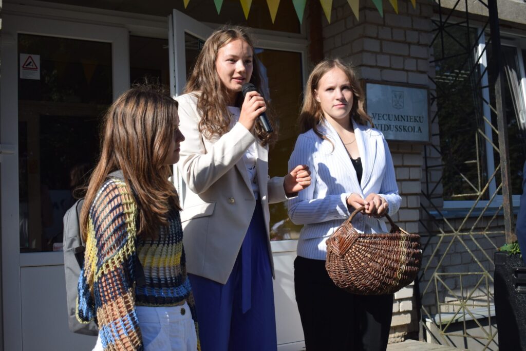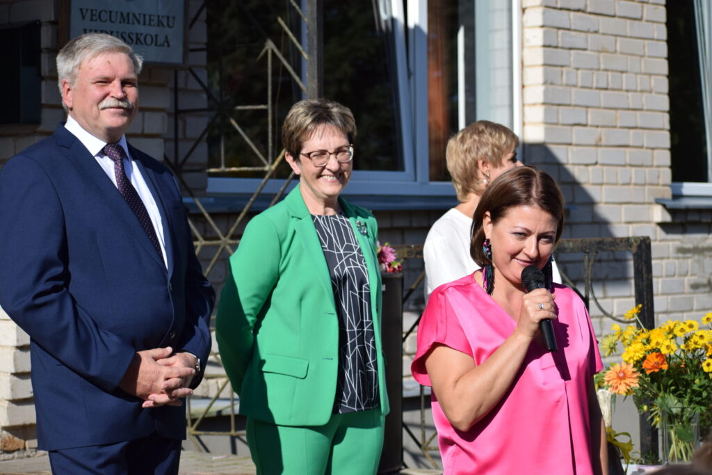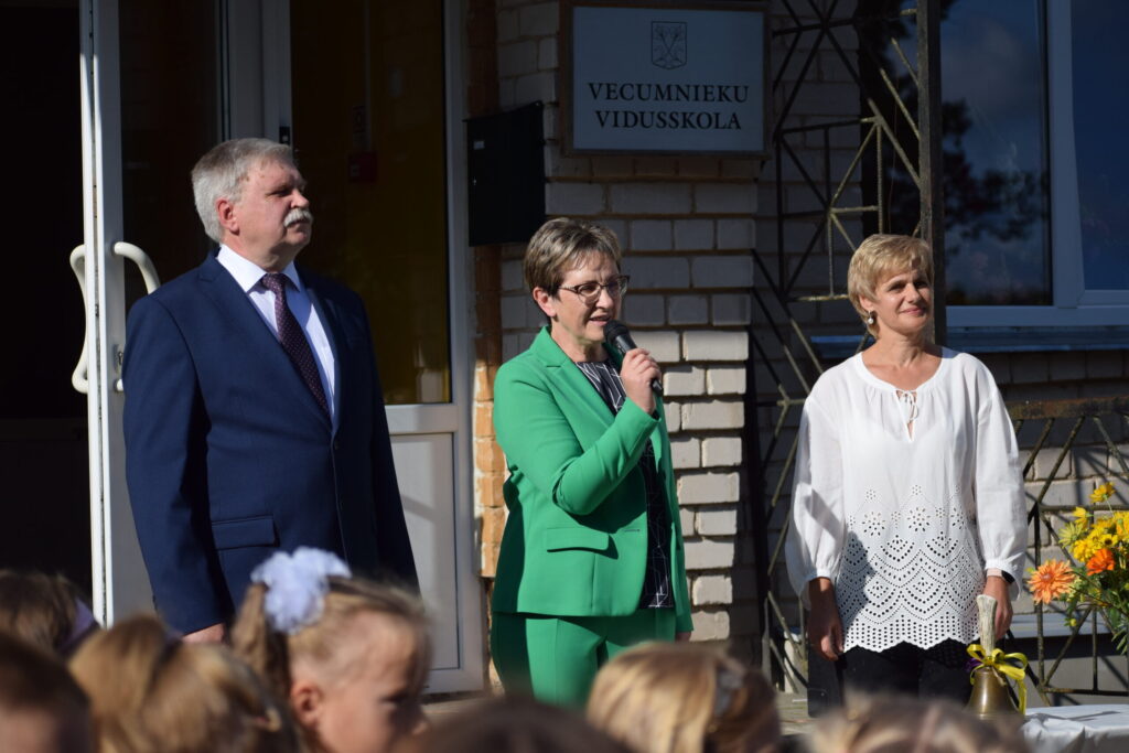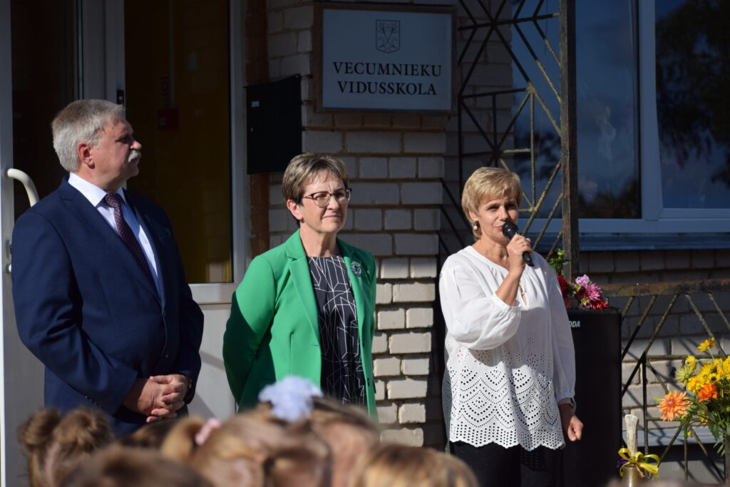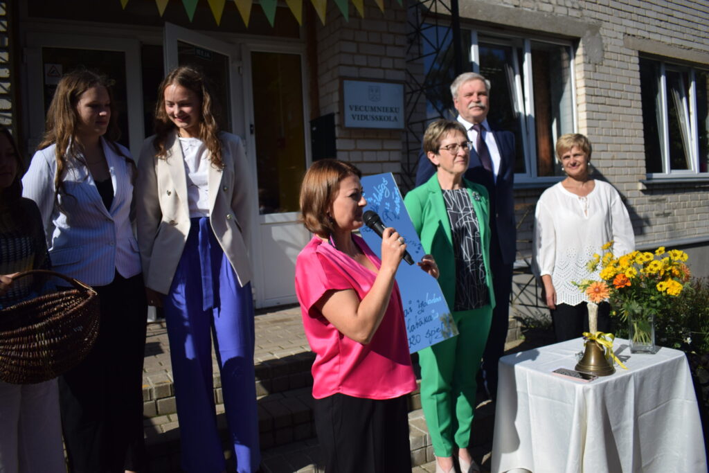 Rolanda Ķiņķevska, direktora vietniece mācību darbā, sveicot visus Zinību dienā, uzsvēra: «Kādreiz teica, ka uz skolu jānāk, lai iemācītos lasīt un rēķināt, tagad – lai domātu, spriestu, argumentētu, sadarbotos.» Viņa mudināja vienmēr paturēt prātā vārdus: laipnība, labestība, labbūtība, tad skola būs vienota un dzīve skaista. R. Ķiņķevska nosauca arī vairākus skaitļus, kas raksturo izglītības iestādes saimi. Vecumnieku vidusskolā mācības sākuši 450 audzēkņu, t. sk. mazajā skolā, kur zināšanas krāj 1. – 4. klašu skolēni, – 175; savās gaitās devies 241 pirmsskolas izglītības grupu audzēknis. Mācību procesu nodrošina 110 darbinieku.