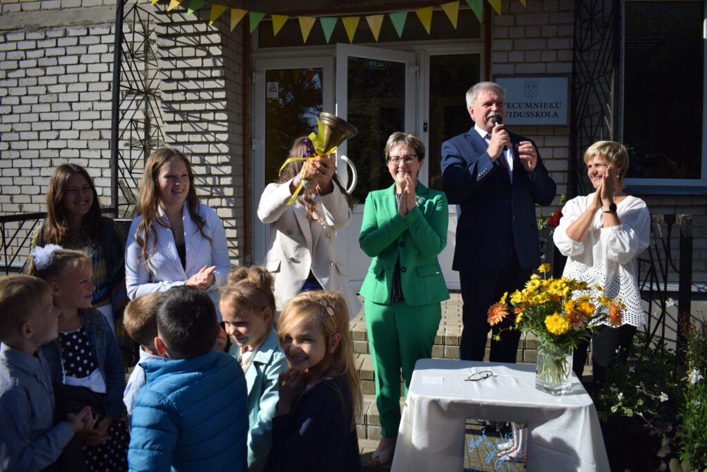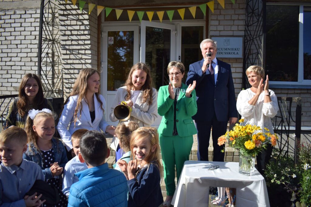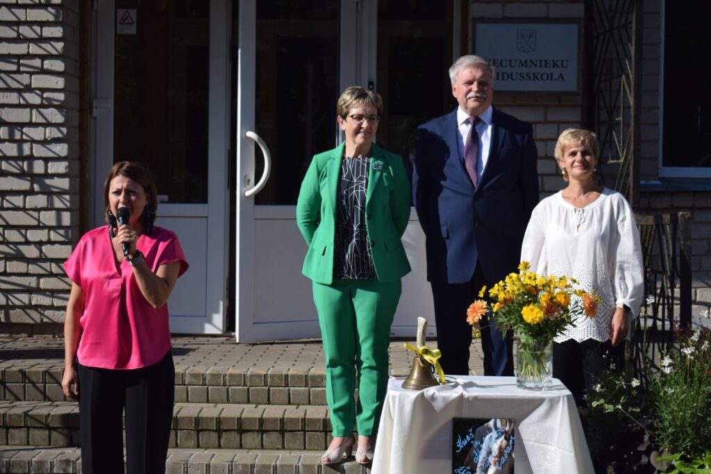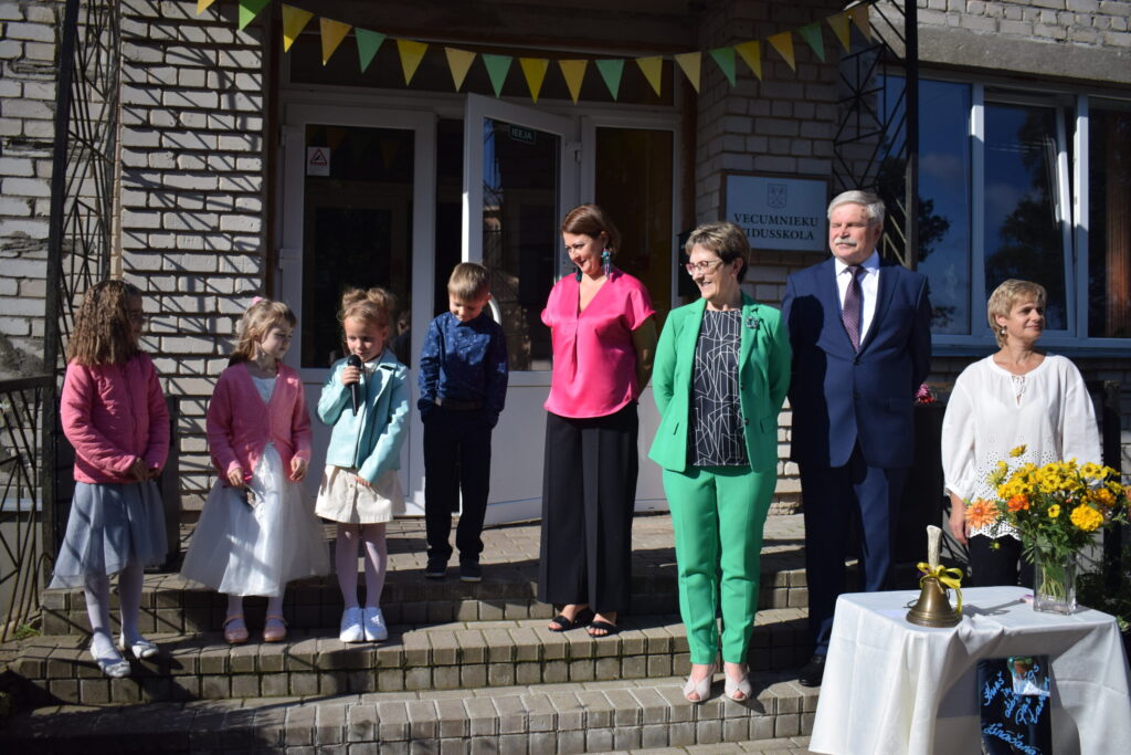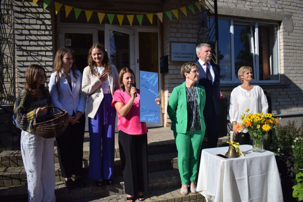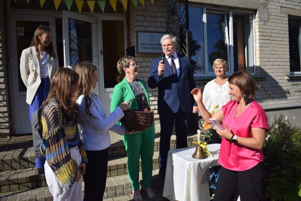 Rolanda Ķiņķevska, direktora vietniece mācību darbā, sveicot visus Zinību dienā, uzsvēra: «Kādreiz teica, ka uz skolu jānāk, lai iemācītos lasīt un rēķināt, tagad – lai domātu, spriestu, argumentētu, sadarbotos.» Viņa mudināja vienmēr paturēt prātā vārdus: laipnība, labestība, labbūtība, tad skola būs vienota un dzīve skaista. R. Ķiņķevska nosauca arī vairākus skaitļus, kas raksturo izglītības iestādes saimi. Vecumnieku vidusskolā mācības sākuši 450 audzēkņu, t. sk. mazajā skolā, kur zināšanas krāj 1. – 4. klašu skolēni, – 175; savās gaitās devies 241 pirmsskolas izglītības grupu audzēknis. Mācību procesu nodrošina 110 darbinieku.