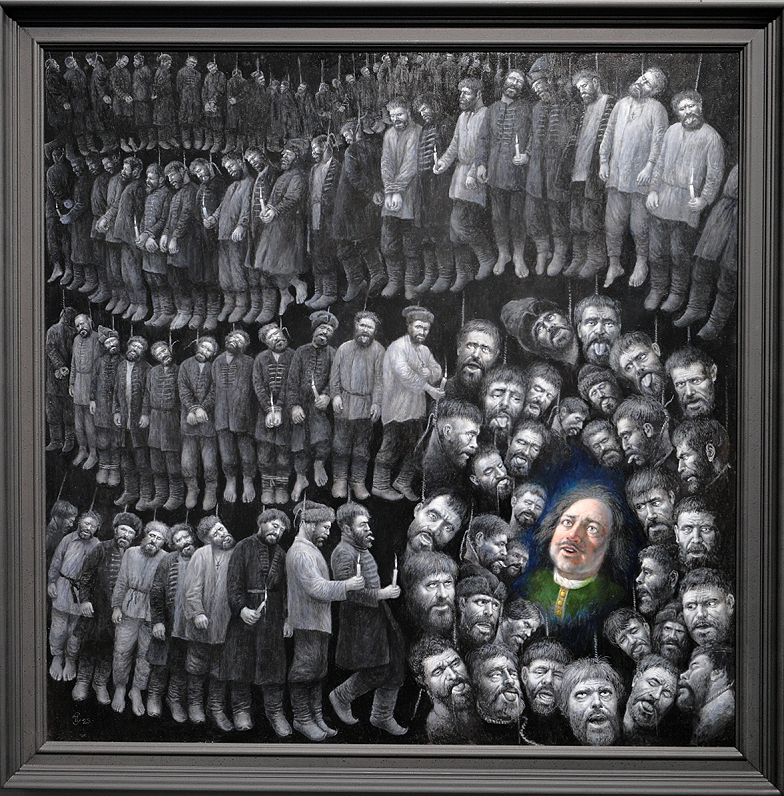 Bet es šos cilvēkus uztveru arī kā upurus, kuriem jūtu līdzi un kurus pozicionēju kā personības ap Pēteri. Es viņos gribu ieraudzīt cilvēkus. Tāpēc man bija ļoti interesanti strādāt ar šīm sejām. Domāju, esmu diezgan detalizēti viņus uzgleznojis, lai parādītu un darītu arī skatītājiem interesantu šo Krievijas pasaulīti, kas iemieso veco, aizejošo Krieviju, kam pretī Preobraženskas pulka uniformā ir šis dusmīgais Pētera ģīmis, kas vienīgais gleznā ir krāsains, jo viss pārējais ir melnbalts. Līdz ar to es arī pasvītroju, ka tā ir spoku pasaule.