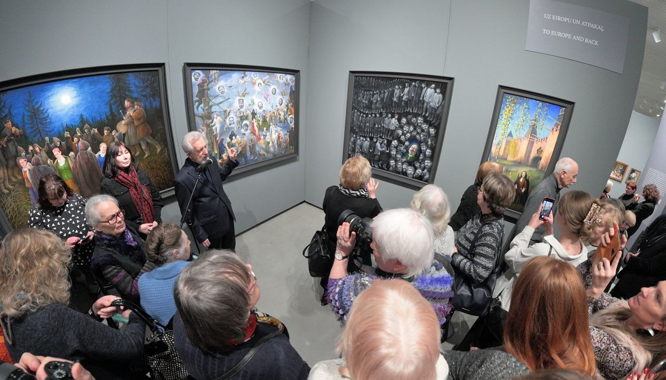 Inta Zēgnere: Tā, šķiet, ir apbrīnojama sajūta, ka mākslinieks ar saviem darbiem var satikties lielā izstāžu zālē… Tie taču ar jums runā, vai ne? Un varbūt tie pat palīdz jums pašam atklāt kaut ko jaunu par sevi? Jo viena lieta ir tad, ja darbs ir mājās un to aplūkojat tuvumā. Bet tagad, kad visa jūsu radīto tēlu pasaule ir vienuviet, tā runā, tā stāsta… Mēs, skatītāji, visticamāk, daudz ko nemākam izlasīt no redzamajiem simboliem – varbūt ar jums šie darbi runā īpašākā valodā?
