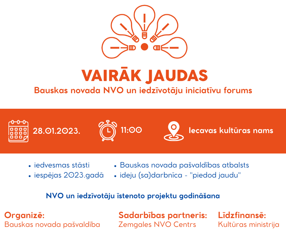 Sestdien, 28.janvārī, plkst.11 Iecavas kultūras namā notiks Bauskas novada nevalstisko organizāciju (NVO) un iedzīvotāju iniciatīvu forums “Vairāk jaudas”.