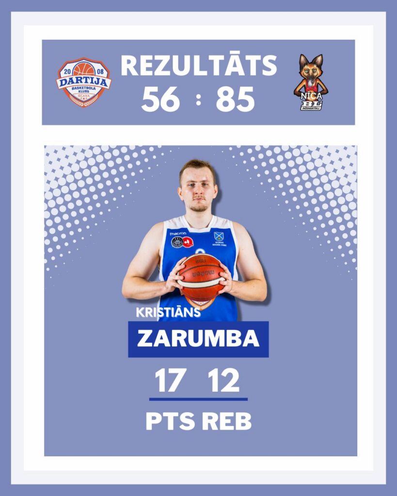 BK “Dartija” rindās rezultatīvākais bija Kristiāns Zarumba, kurš aizvadīja vēl vienu spožu spēli, tiekot pie kārtējā “double-double” – 17 punkti un 12 atlēkošās bumbas.