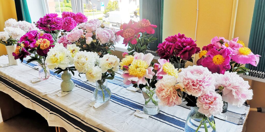 Edvarta Virzas Iecavas bibliotēkā ir apskatāmi peoniju ziedi no Andreja Lasmaņa dārza, Māra Stiprā peoniju fotogrāfijas, kā arī Ilonas Grīnbergas veidotie peoniju ziedi. Interesentiem otrdien bija iespēja satikt krāšņo ziedu audzētāju «vaigā», kā arī uzzināt lietas, kuras jāņem vērā audzējot šīs puķes.