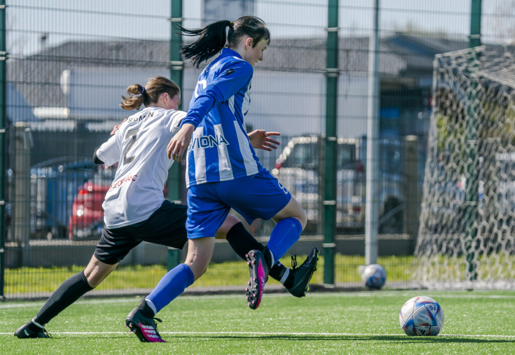 Attēlā – Santa Sanija Vuškāne (tuvplānā 8. numurs) mačā ar «RFS» komandu guva divus vārtus. Foto no «lff.lv».