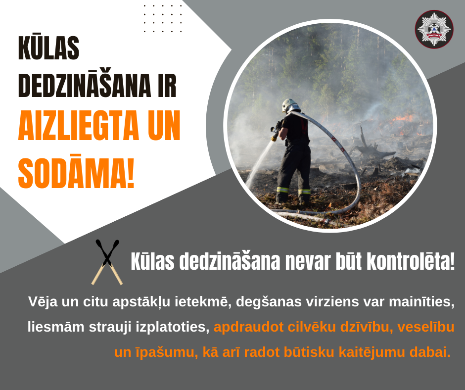 Savukārt, ja pamanīta persona, kas dedzina kūlu, jāzvana ugunsdzēsējiem pa glābšanas dienestu tālruni 112 un par pārkāpēju jāziņo Valsts policijai.