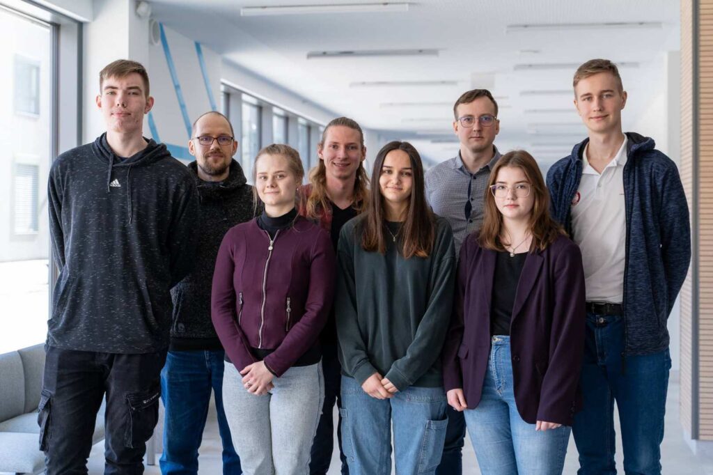 Pirms došanās uz Šveici CERN ēnas – (pirmajā rindā no kreisās) Gustavs Petters, Marija Berdigāne, Elza Mitenberga, Unda Kozlova un Armands Grencis – tikās ar RTU pētniekiem – (otrajā rindā no kreisās) Viesturu Lāci, Andri Potrebko un Artūru Ivanovu –, kuri studiju darbus savulaik ir izstrādājuši CERN un tagad atgriezušies Latvijā, kur turpina studijas un darbu. Foto: Vitālijs Vinogradovs, RTU