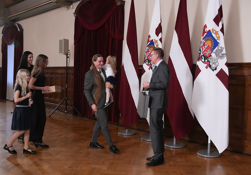 “Jūs esat darījuši daudz, lai saviem bērniem dotu visu to labāko. Jūs vienmēr esat bijuši ļoti gādīgi vecāki. Es gribu teikt tiešām lielu paldies gan jums, gan visiem jūsu tuviniekiem, kuri jūs ir atbalstījuši, jo kuplas ģimenes mūsdienās nav pašsaprotama lieta. Man ir liels prieks un gods šodien kopā ar jums sākt svinēt Ziemassvētkus Rīgas pilī!” uzrunājot ģimenes, sacīja Valsts prezidents E. Rinkēvičs.