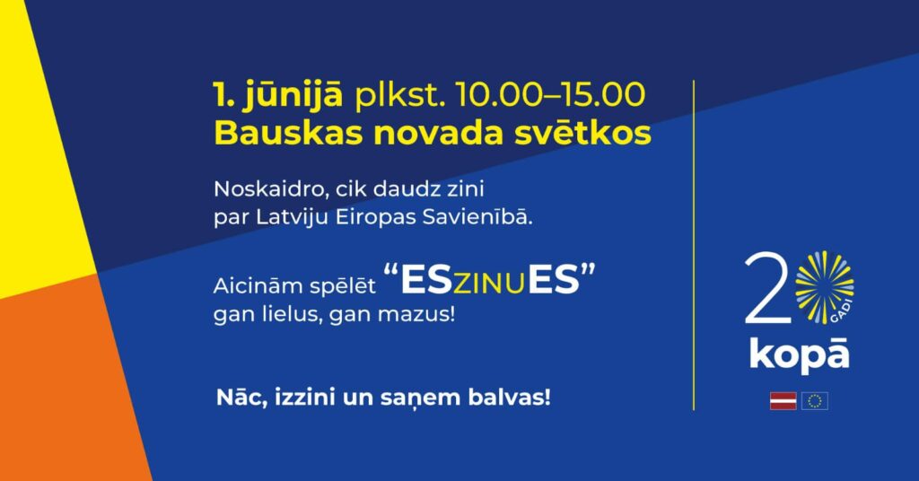Šogad Latvija atzīmē 20 gadus kopš iestāšanās Eiropas Savienībā. Tam par godu notikuši daudzi pasākumi un aktivitātes, un arī vasarā iedzīvotāji aicināti izmantot iespēju apliecināt savas zināšanas un aizraujošā veidā pavadīt laiku dažādos pasākumos, iepazīstot Eiropas lietas un piedaloties izzinošā spēlē “ESzinuES”. Spēli vairāku svētku un festivālu apmeklētājiem piedāvā Eiropas Komisijas pārstāvniecība Latvijā. Spēlē “ESzinuES” ikviens interesents varēs piedalīties arī Bauskas novada svētkos sestdien, 1. jūnijā, portālu informēja Eiropas Komisijas pārstāvniecības Latvijā preses dienestā.