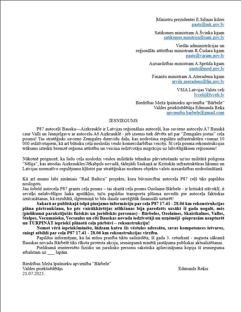 Šobrīd Bauskas novada Vecumnieku apvienības pagastu iedzīvotāju vidū valda satraukums un neizpratne par pēkšņajām izmaiņām, kas rosinājusi uz aktīvu rīcību – sagatavota atklāta vēstule valsts augstākajām amatpersonām un šonedēļ sākta parakstu vākšana, lai pieprasītu ceļa rekonstrukcijas projekta turpināšanu un nepieļautu tā “nozušanu” Satiksmes ministrijas kabinetu atvilktnēs. Savukārt augusta sākumā Bārbelē ieplānota protesta akcija, kas patlaban tiek saskaņota ar Bauskas novada pašvaldību.