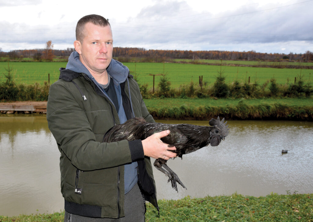Mazliet atstatus no pārējām mājiņām pēcizstādes karantīnā pavisam vientuļš dienas pavada īstā Mārtiņdienas gaiļa titulu pelnījušais ‘Ayam Cemani’. Indonēzijā selekcionētajai šķirnei melnums radies ģenētisku pārmaiņu rezultātā. Turklāt melns ir ne tikai eksterjers, bet arī kauli, rīkle un pat iekšas. Pretēji izplatītajam mītam, olas gan šim melnulim ir ikdienišķā krēmkrāsā. Toties cālēni –melniņi kā velniņi. ‘Ayam Cemani’ bija vistu izstādes zvaigzne. Jānis šīs melnās vistas tur jau kopš 2014. gada, taču tikai tagad ap tām sacelta tāda ažiotāža. Atšķirībā no pārējo šķirņu gaiļiem šiem esot raksturiņš. Vispār gaiļu tāpat kā cilvēku pasaulē kauslīgi ir atsevišķi indivīdi. Prasām Jānim, vai arī viņa putnu saimē tādi ir, un viņš atkal atjoko: «Ja tādus pamanām, tad liekam sludinājumā.»