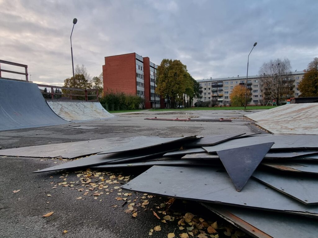 Starp divām pusnoārdītām skeitparka rampām mētājas prāva nolietota finiera kaudze. Metāla barjera noguldīta pa vidu, konstrukciju atverēs atklājas iespaidīgs atkritumu slānis. Ne norobežojuma, ne brīdinājuma par darbu veikšanu.