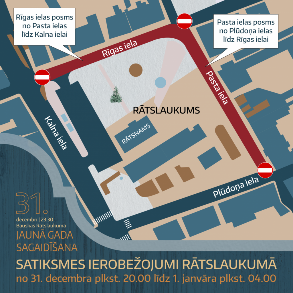 Bauskas kultūras centra pārstāve K.P.Lībiete informē, ka pasākuma norises dēļ jau no 31. decembra plkst. 20 līdz 1. janvāra plkst. 04 iedzīvotājiem jārēķinās ar satiksmes ierobežojumiem Bauskas Rātslaukuma teritorijā. Satiksme nebūs iespējama Rīgas ielas posmā no Pasta ielas līdz Kalna ielai. Savukārt Pasta iela autobraucējiem būs slēgta posmā no Plūdoņa ielas līdz Rīgas ielai.