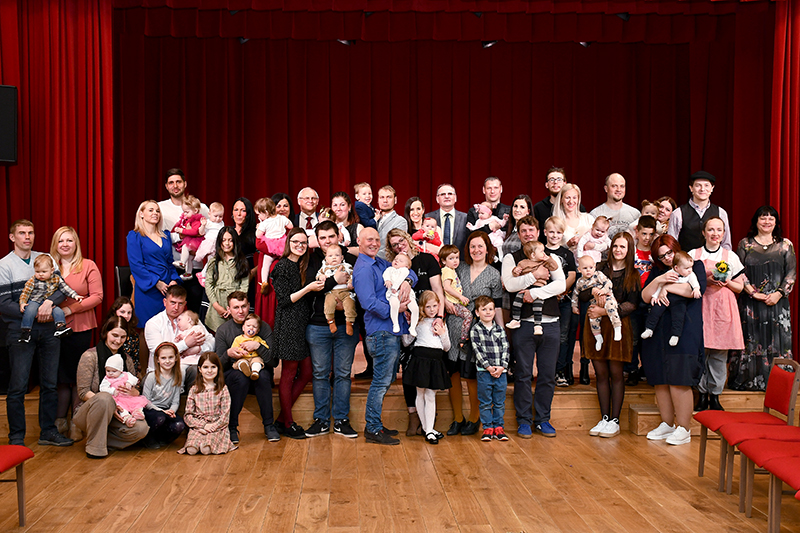 Kopbildē Rundāles apvienības ģimenes ar pērn dzimušajiem mazuļiem kopā ar sarīkojuma organizatoriem un māksliniekiem. Foto – Ivars Bogdanovs.