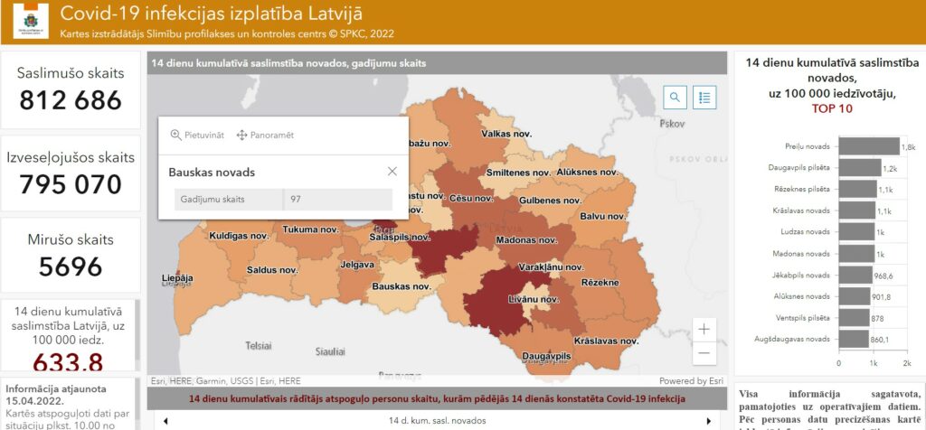 No pašvaldībām pirmajā vietā ir Preiļu novads, kur 14 dienu saslimstība ar Covid-19 uz 100 000 iedzīvotāju aizvadītās dienas laikā bija 1760,2 gadījumi, seko Daugavpils ar 1230,4 gadījumiem un Rēzekne ar 1099,1 gadījumu uz 100 000 iedzīvotāju.