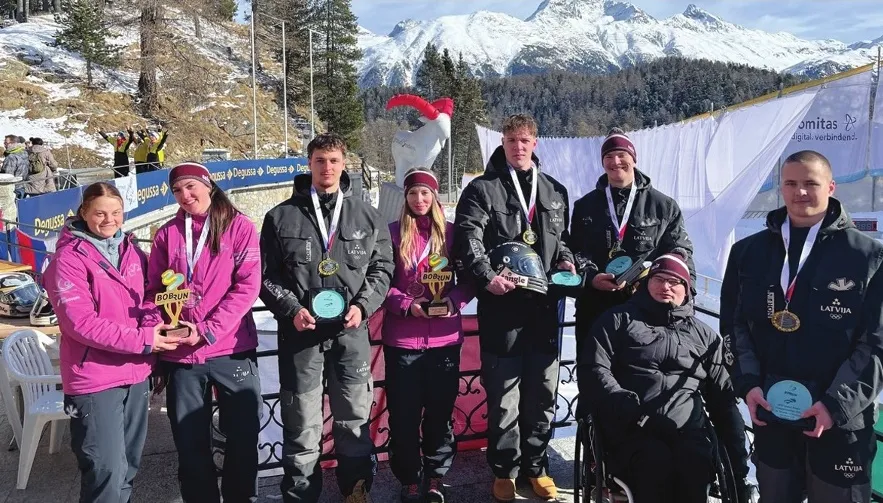PASAULES ČEMPIONĀTĀ bobslejā 2026. gada dalībnieki ar izcīnītajām godalgām. Pirmais no labās Andris Skadiņš. FOTO NO LATVIJAS BOBSLEJA UN SKELETONA FEDERĀCIJAS ALBUMA.