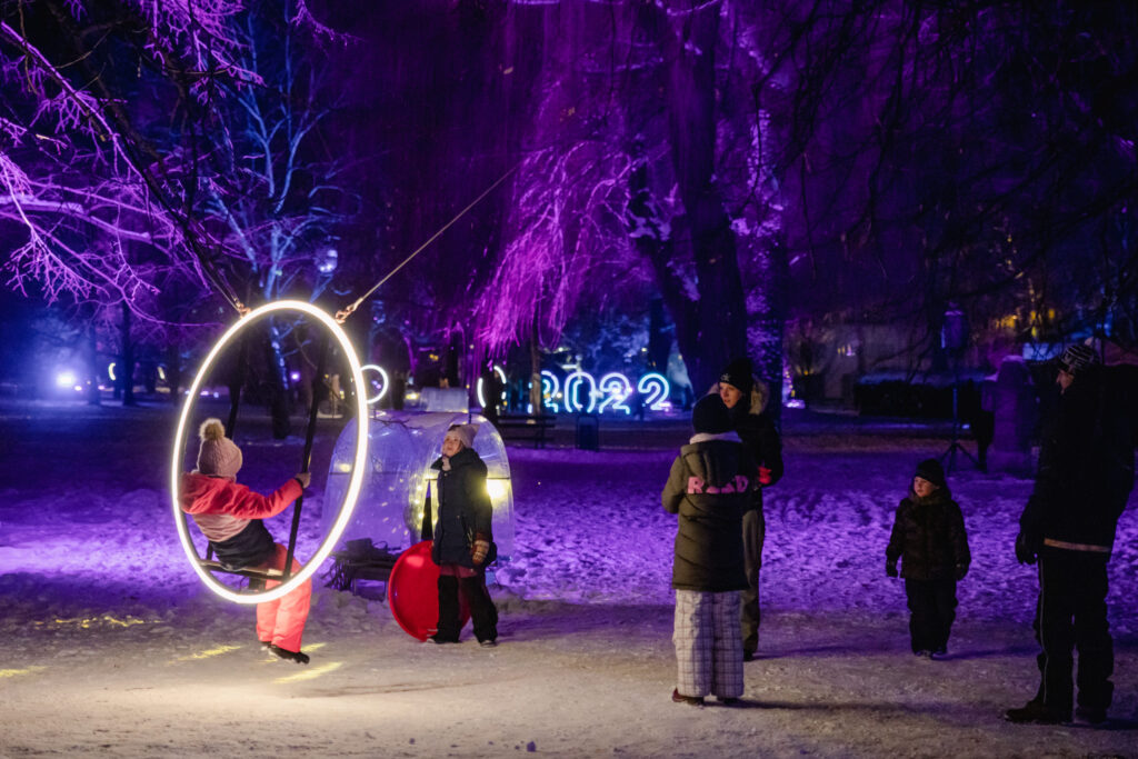 Šajā nedēļā svētku rota papildināta ar spilgti izgaismotu gadskaitli “2022”.