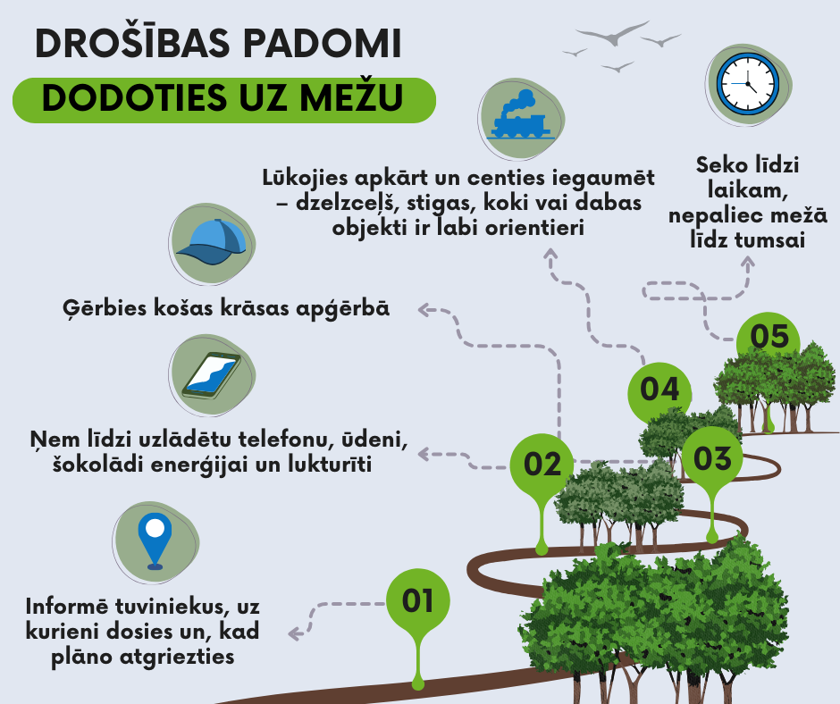 - mežā nedodieties vienatnē, lai nepieciešamības gadījumā otrs cilvēks varētu palīdzēt;