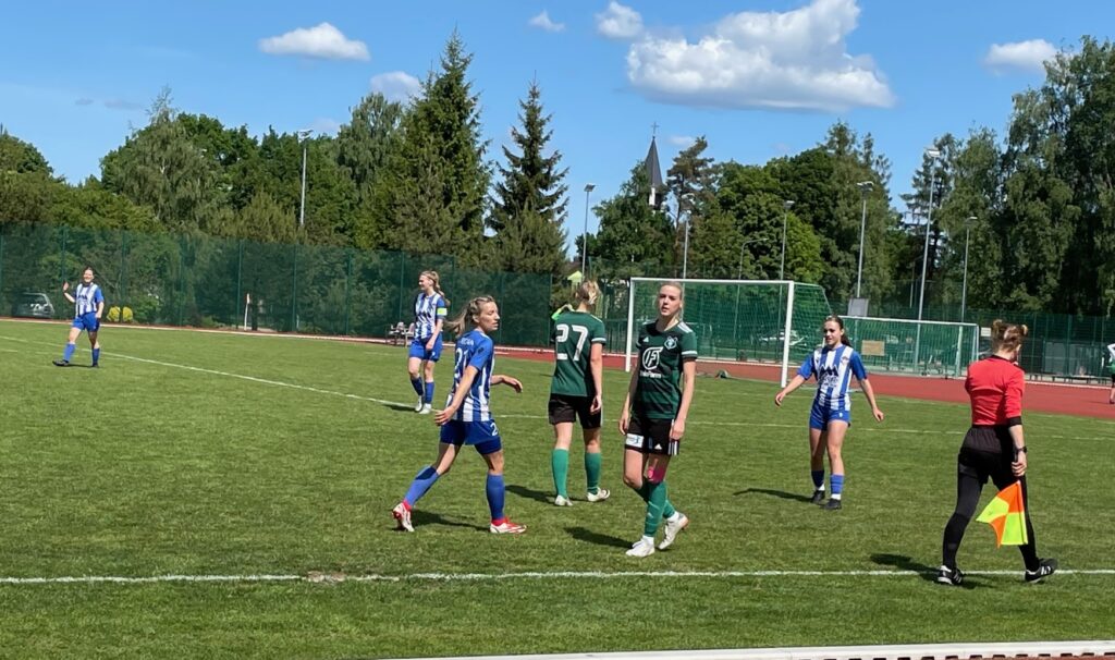 Titulattēlā – kluba “Iecava” futbolistes (zili baltos tērpos) vienā no mājas spēlēm savā laukumā Iecavā. Foto no “Bauskas Dzīves” arhīva.