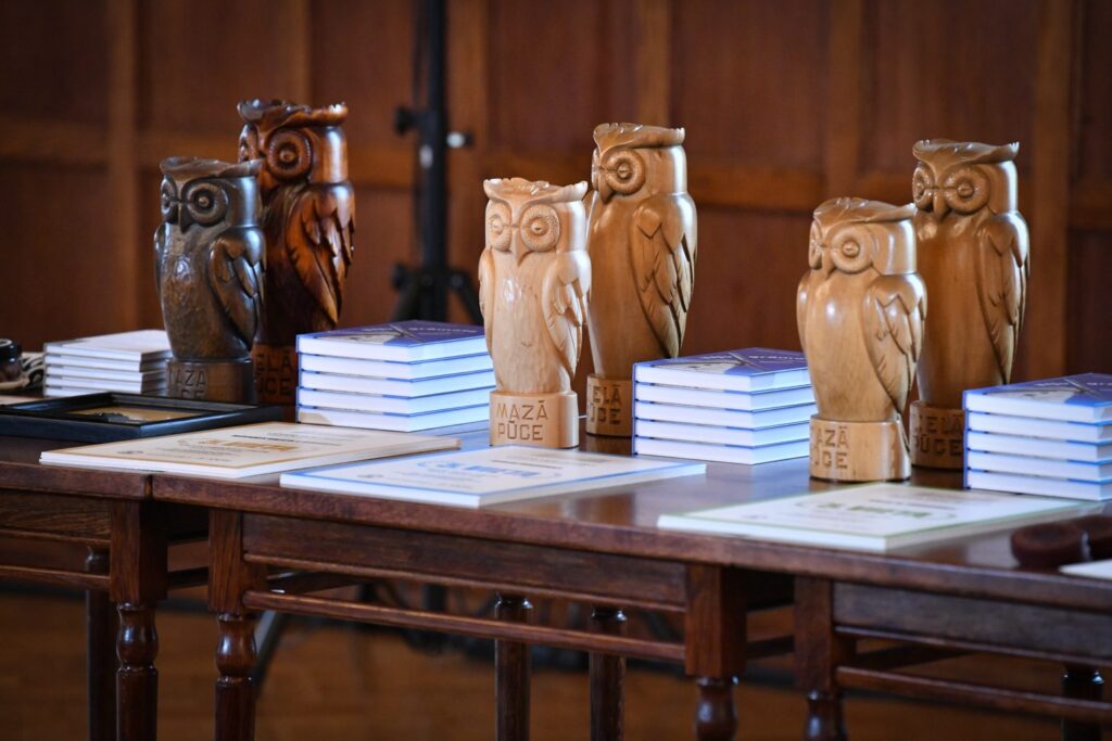 Attēlā – balvas. Lielo skolu grupas pirmās un otrās vietas ieguvējiem tiek piešķirta „Lielā Pūce”, bet mazo skolu grupas pirmās un otrās vietas ieguvējiem – „Mazā Pūce”. Foto: Valsts prezidenta kancelejas arhīvs.