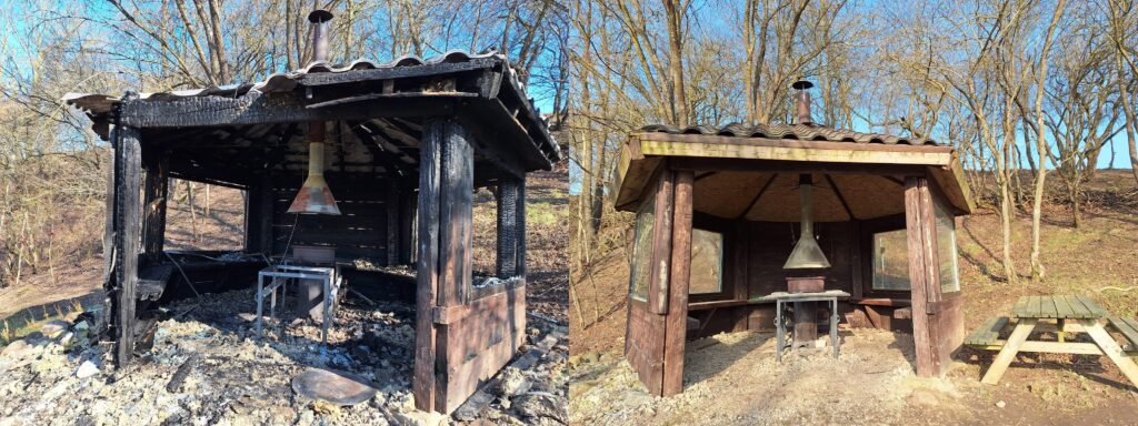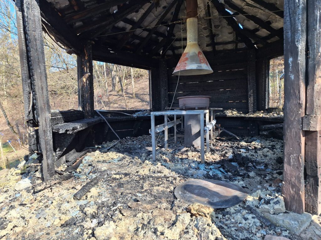 Lapeni pamazām sāka celt kovidlaikā ap 2021. gadu. Sākumā bijušas sienas, jumts, tad ierīkoti arī logi. Īpašniekam ļoti žēl sadegušā kokmateriāla, kas izmantots lapenes būvniecībai. Tam bijusi īpaša emocionāla vērtība – koks nācis no tēva mājām, kuras nu jau nojauktas. Tā bija piemiņa, kas no tām palikusi. Tagad viss izpostīts.
