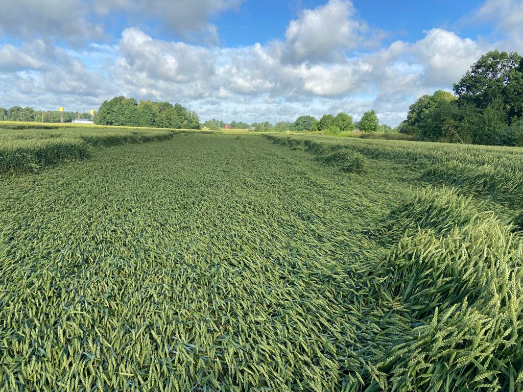 Lietusgāzes ar mērenu vēju padarīja savu. Pamatā saveldrējušies ražīgākie ziemas kviešu sējumi, kur smagākas vārpas un lielāks ražas potenciāls. Vērtējot šķirnes, vairāk sakritis ‘Skagen’, arī ‘Patras’ u. c. Redzēju arī saveldrētus vasarāju – kviešu un miežu – laukus, piebilda Ieva Litiņa.