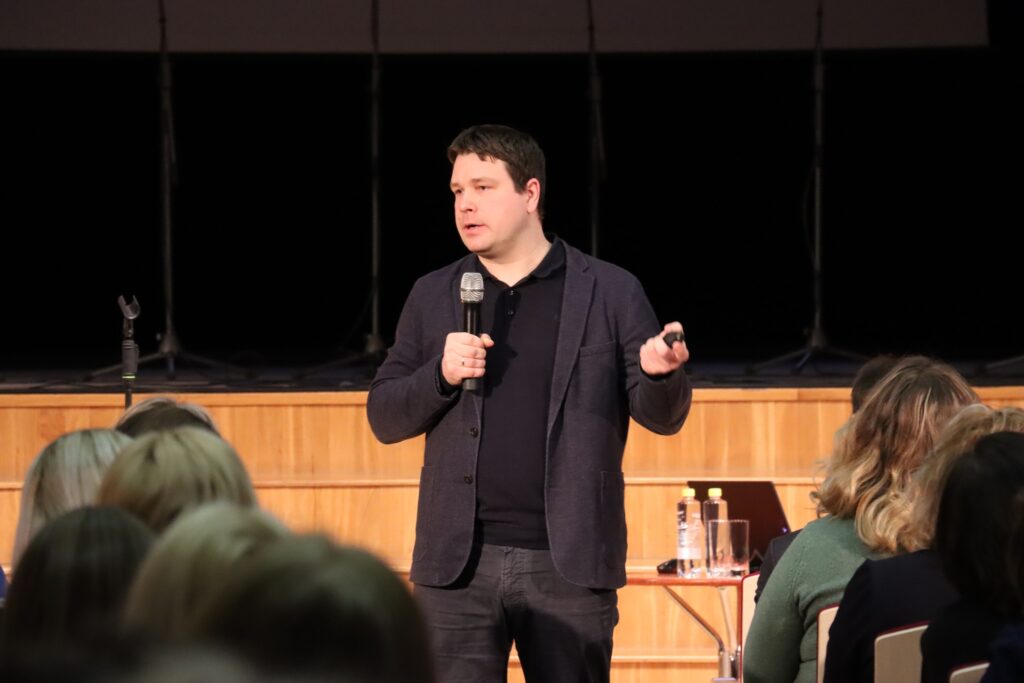 Priekšpusdienā darbs norisinājās kultūras namā. Ar apmēram 450 pedagogu lielo auditoriju (pārstāvēts bija vairāk nekā 130 skolu no visas Latvijas) tikās eksperti. Supervizore un konsultante Inga Pāvula, kura vairāk nekā 30 gadu strādājusi izglītības jomā, meklējot jaunus risinājumus, Latvijas Universitātē mācījusi jaunos pedagogus, un Valsts izglītības satura centra vecākais eksperts, Rīgas 72. vidusskolas direktors Pāvels Pestovs. Konferences pirmajai daļai interesenti varēja sekot līdzi arī tiešraidē sociālajā vietnē YuoTube, ierakstu tur var noskatīties joprojām.