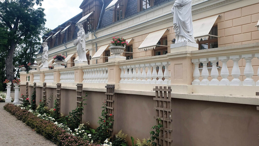 Žagares pilsētas vidū plešas muižas parks, kuram kā koša rota piekļaujas 2013. gadā atjaunotā pils – majestātiska, grezni rotātām fasādēm, košu un bagātīgu apstādījumu ieskauta. Pilī izveidots Žagares reģionālā parka apmeklētāju centrs. Muižas komplekss būvēts 19. gadsimta otrajā pusē un ir viens no lielākajiem Lietuvā. Īpaši pārsteidza, ka bez pils saglabājušās vēl arī angļu Tjūdoru stila saimniecības un dzīvojamās ēkas kopskaitā ap divdesmit. Apbrīnas cienīgs ir apjomīgais neogotikas stila muižas staļļu komplekss. Staļļos joprojām mīt un tiek trenēti zirgi.