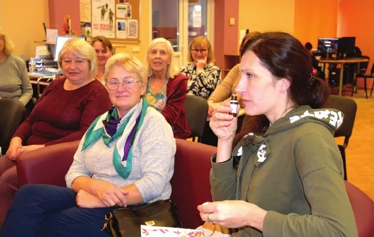Stāstījuma noslēgumā Vineta Skalberga klausītājiem bija sarūpējusi pārsteigumu un vienlaikus arī pārbaudījumu. Dalībnieku uzdevums bija izsmaržot un uzminēt, kādu 15 garšauga ēteriskās eļļas pudelītes ir atnestas. It kā nevajadzētu būt grūti atšifrēt tik zināmos aromātus, tomēr pat diļļu sēklu eļļa ne visiem šķita atpazīstama. Kur nu vēl tādi mazāk smaržoti augi kā izops, koriandrs, kumīns, timiāns! Minēšana pasākumu apmeklētājus pamatīgi aizrāva, taču beigās sasmaržotā buķete pat viegli reibināja galvu.