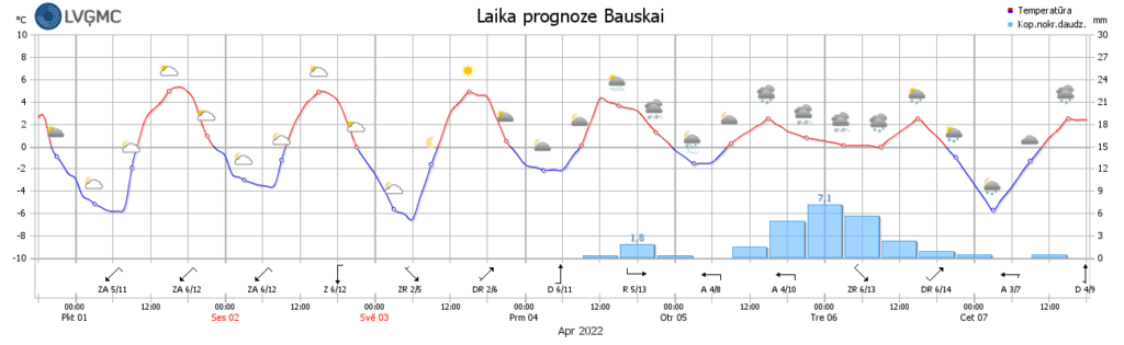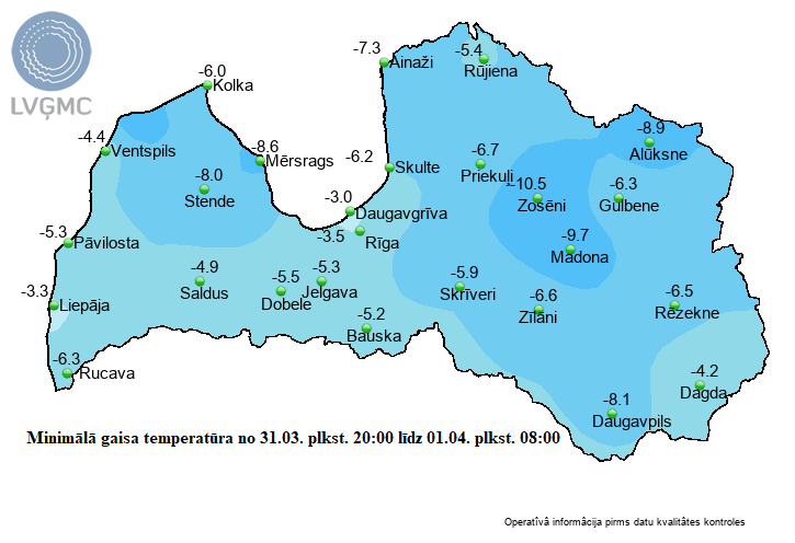 S. Pelēķe sacīja, ka aprīļa pirmajā pusē būtiskas izmaiņas gaisa temperatūras režīmā nav gaidāmas, ja to salīdzina ar marta pēdējām dienām, – naktīs bieži piesals, termometra stabiņam atsevišķos gadījumos noslīdot pat zem -5 grādu atzīmes, bet dienas vien saulainākos brīžos gaiss iesils līdz +4 – +6 grādiem, bet pastāv varbūtība, ka vēl piedzīvosim arī kādu dienu, kad arī dienā saglabāsies neliels sals.
