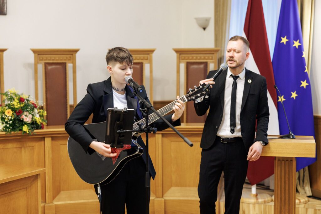 Konkursa uzvarētāji, sadarbības partneru izvirzītie laureāti, kā arī atzinību ieguvēji tika nosaukti konkursa apbalvošanas ceremonijā 16. februārī Satversmes tiesā. Svinīgajā pasākumā klātesošajiem muzikālu priekšnesumu sniedz Ralfs Eilands un Emilija Bērziņa. Foto: Publicitātes foto