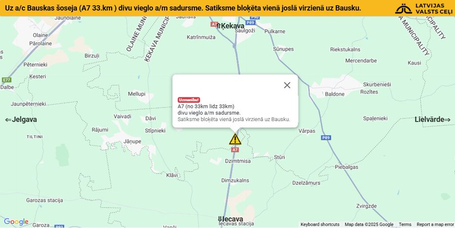 Pirmdienas, 27. janvāra, vakarā ceļu satiksmes negadījuma dēļ uz stundu tika bloķēta satiksme pa Bauskas šoseju starp Ķekavu un Iecavu, informēja VSIA “Latvijas valsts ceļi”, atsaucoties uz Valsts policiju.