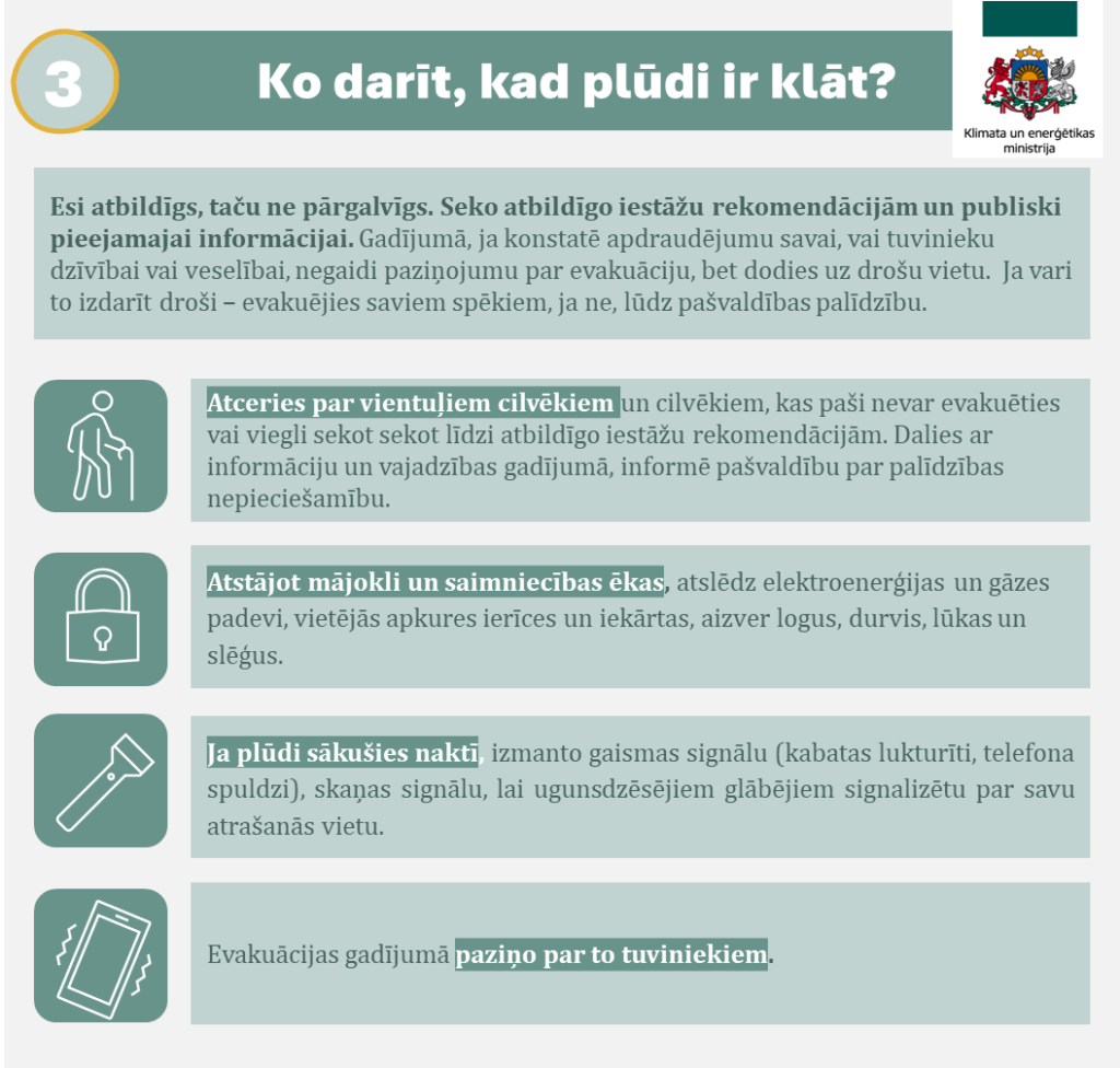 Arī Jēkabpilī, kad bija lielie plūdi, daudzi nenoticēja un palika savās mājvietās, taču vieglāk iedzīvotājus ir evakuēt, kad nav bīstamības, jo pēcāk nedroši ir pašiem glābējiem,” norādīja L. Klints. Viņa vērsa uzmanību, ka upes krastā dzīvojošie var sekot līdzi ūdens līmeņa atzīmēm LVĢMC mājslapā, kur divas reizes stundā ienāk jaunākā informācija no hidrostacijām. (Par aktuālo situāciju, prognozēm un iespējamiem scenārijiem var lūkot “Plūdu riska informācijas sistēmā” https://pris.lvgmc.lv/ )