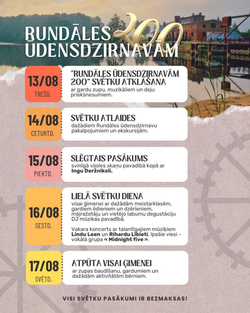Šonedēļ Rundāles ūdensdzirnavu muzejs atzīmēs nozīmīgu notikumu – ūdensdzirnavu 200 gadu jubileju. Laika posmā no 13. līdz 17. augustam apmeklētājus sagaida dažādas aktivitātes – no muzikāliem un kulināriem piedzīvojumiem līdz aizraujošām nodarbēm bērniem, portālu informēja Rundāles ūdensdzirnavu muzeja vadītāja Santa Švāģere.