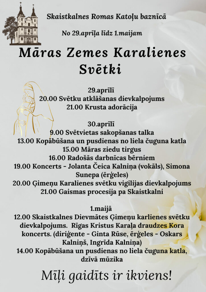 Savukārt 1.maijā plkst.12 Skaistkalnes svētvietā dievkalpojumu vadīs Jelgavas Romas katoļu diecēzes bīskaps Edvards Pavlovskis.