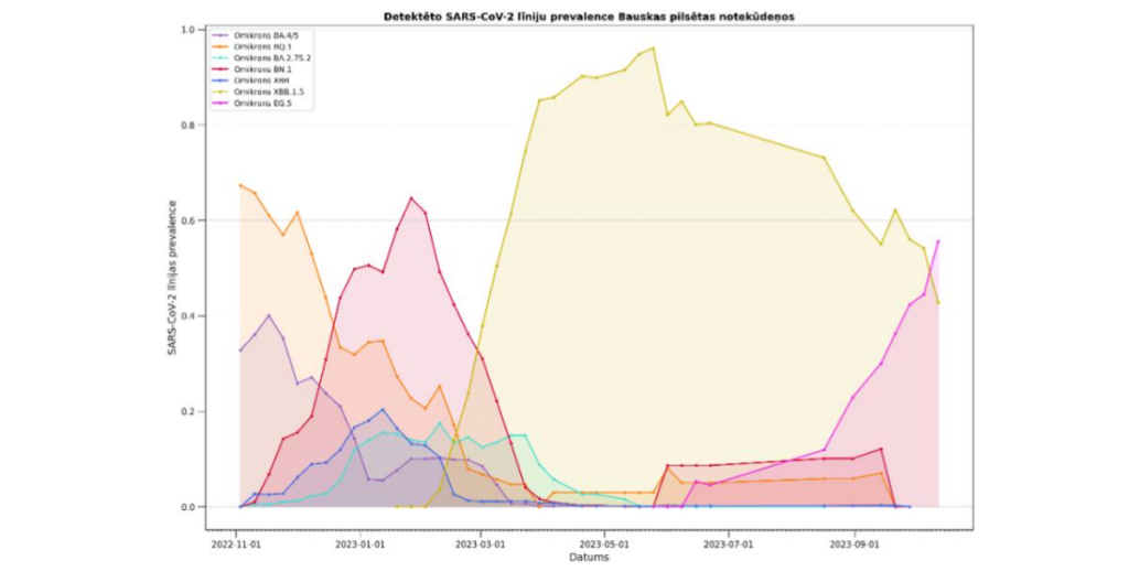 Saņemti arī jaunākie dati no notekūdeņu monitoringa, kur redzams, ka vairākās pilsētās novēro strauju pieaugumu omikrona “EG.5” jeb “Eris” paveida klātbūtnei.