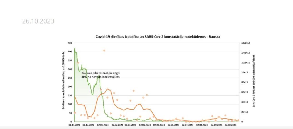 Monitoringa dati rāda, ka Bauskas pilsētas notekūdeņos dominē “EG.5” klātbūtne, kura pieaug. Konstatēta arī “Omikron XBB.1.5” apakšlīnija, bet tās klātbūtnei ir tendence samazināties.