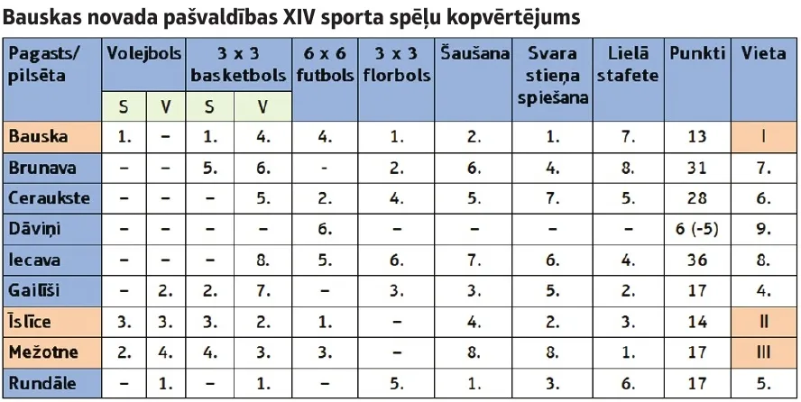 Komandu sporta spēlēs pārliecinoši dominēja Bauskas pilsēta – uzvara volejbolā sievietēm un 3 x 3 basketbolā vīriešiem, pārliecinoši labākie arī florbolā un svaru stieņa spiešanā. Šeit jāpateicas jaunajām meitenēm, kuras aizvadīja lielo stafeti un spēja finišēt, lai arī bija tikai septītās ātrākās starp visām komandām.