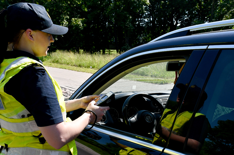 Pie Mēmeles ielas apļa un turpat uz ceļa Kundziņi–Bauska cita ekipāža stādināja automobiļus un, izmantojot alkometra pasīvo režīmu jeb pūšanu aptuveni desmit centimetru attālumā, pārbaudīja, vai šoferi nav sēdušies pie stūres kunga prātā. Ja aparāts uzrādītu reibumu, tad promiles noskaidrotu, jau izmantojot aktīvo režīmu jeb pūšanu caurulītē.