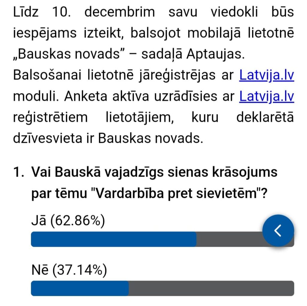 Līdz svētdienai, 10. decembrim, savu nostāju – vai pilsētā nepieciešams murālis par tēmu “Vardarbība pret sievietēm”- var izteikt, balsojot mobilajā lietotnē „Bauskas novads” – sadaļā “Aptaujas”. Līdz sestdienas, 9. decembra rītam, aptauju bija aizpildījuši 36 dalībnieki un vairākums atbalstījuši šāda murāļa izveidi Bauskas pilsētā.
