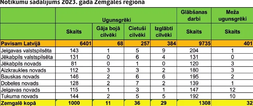 Aizvadītajā gadā Zemgalē ugunsgrēkos gāja bojā 11 cilvēki, kas ir par vienu cilvēku mazāk nekā 2022. gadā. Ugunsgrēkos cieta 36 cilvēki, kas ir par sešiem vairāk nekā gadu iepriekš, un izglābti 29 cilvēki, kas ir mazākais izglābto skaits pēdējos četros gados.