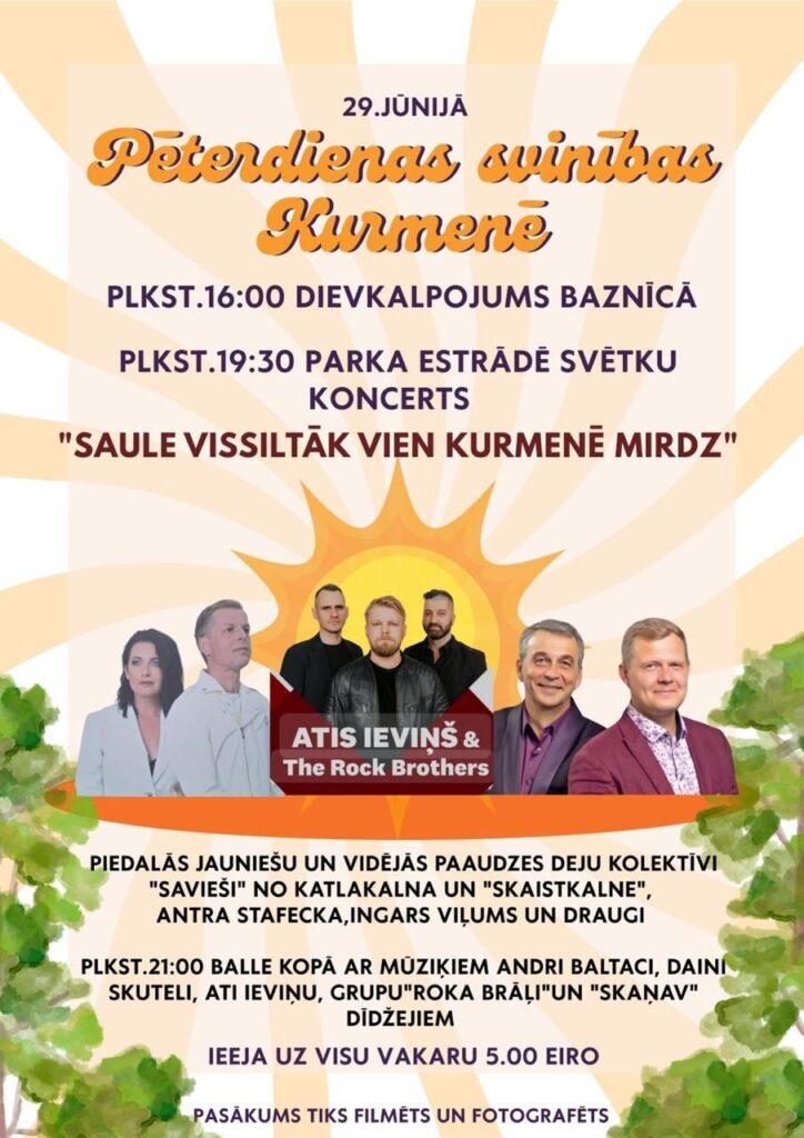 Svētku kulminācija būs vakara koncertprogramma “Saule vissiltāk vien Kurmenē mirdz”, kas sāksies pulksten 19 parka estrādē. Uz skatuves kāps dziedātāja Antra Stafecka, mūziķis Ingars Viļums un draugi, kā arī jauniešu un vidējās paaudzes deju kolektīvi “Savieši” no Katlakalna un “Skaistkalne”. Pēc koncerta svinības turpināsies ar zaļumballi, kurā spēlēs Andris Baltacis, Dainis Skutelis, Atis Ieviņš un grupa “Roka brāļi”, kā arī “SKAŅAV” dīdžeji.