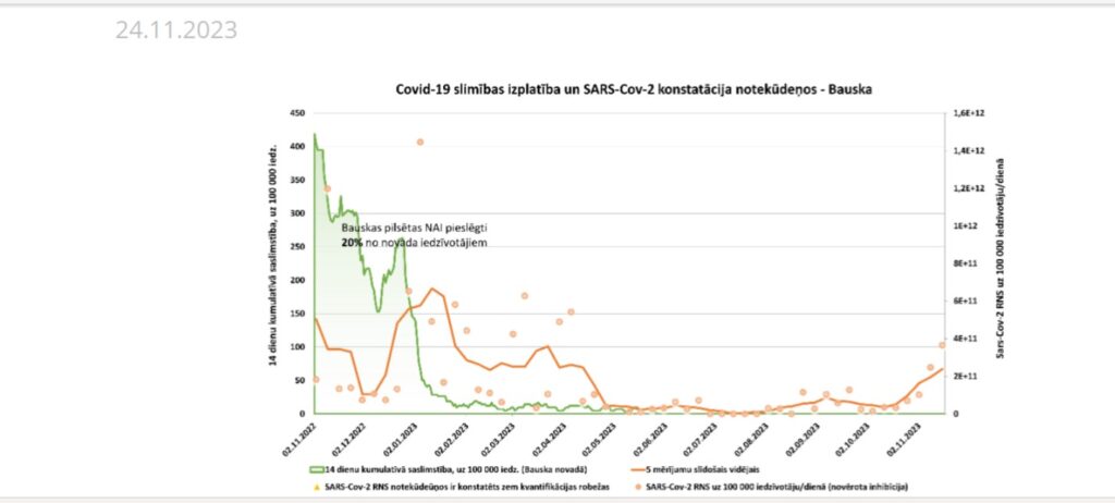 Notekūdeņu monitoringa dati liecina, ka joprojām novērots SARS-CoV-2 vīrusa RNS koncentrācijas pieaugums. Lielā daļā pašvaldību un Latvijā vidēji vīrusa RNS koncentrācija jau šobrīd ir augstāka nekā pagājušās sezonas maksimums visā sezonas laikā.