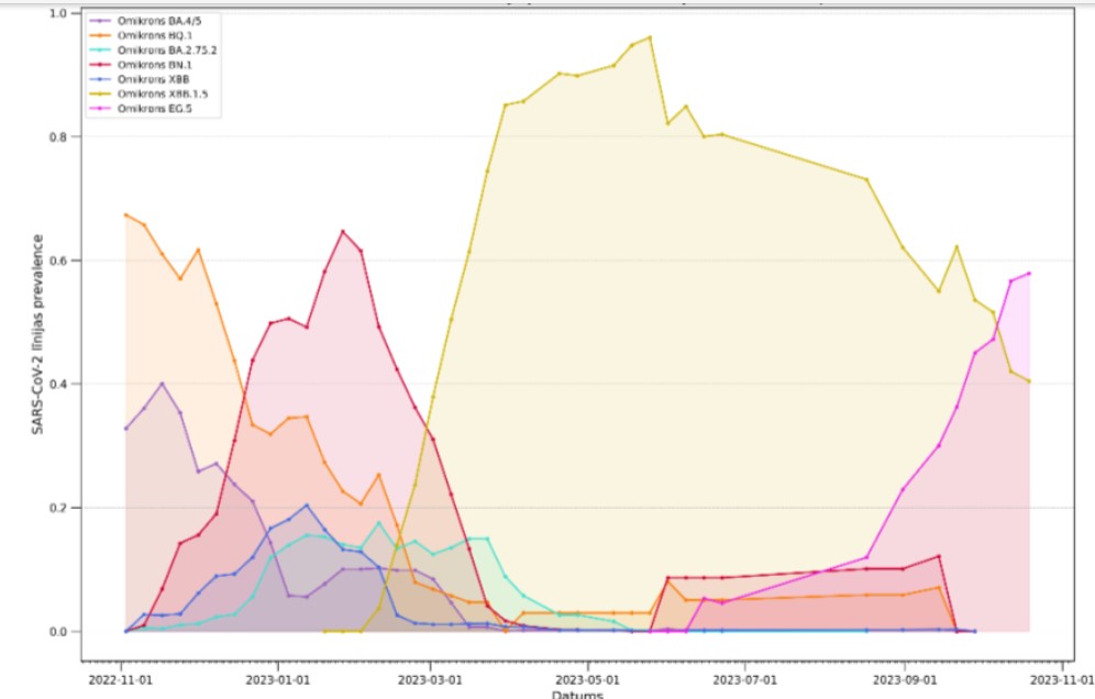 Bauskas pilsētas notekūdeņos dominē EG.5 jeb “Eris” paveida klātbūtne, kura pieaug. Pārējo paveidu klātbūtne samazinās.