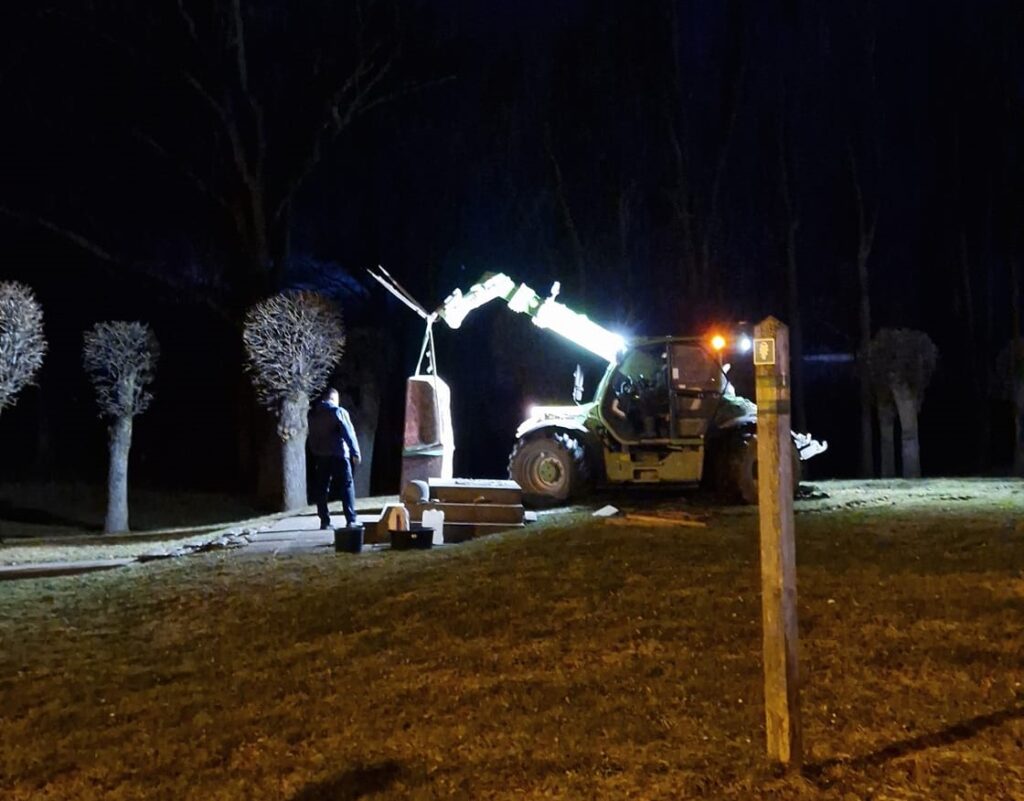 Pieminekļus neviens šķībi neliek un arī ar javu necukojas. Ja nebūs likts armejums, to atkal nogāzis, ja reiz šķībi tas stāv...