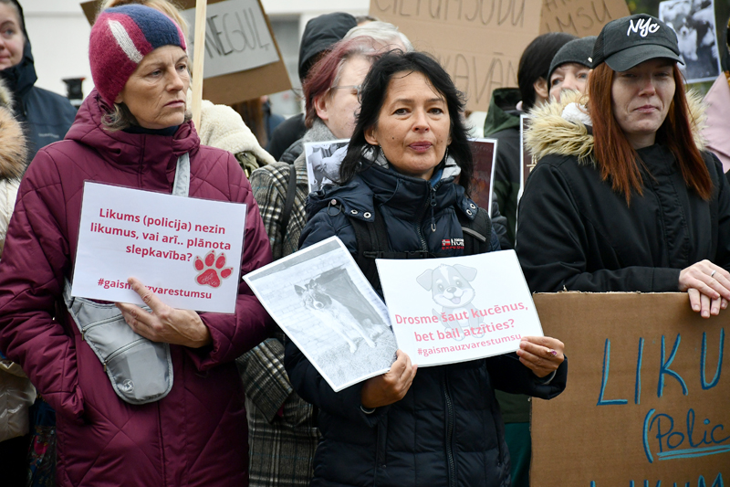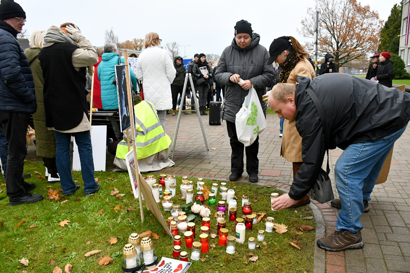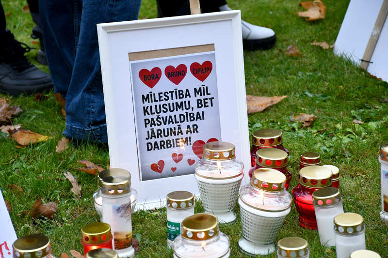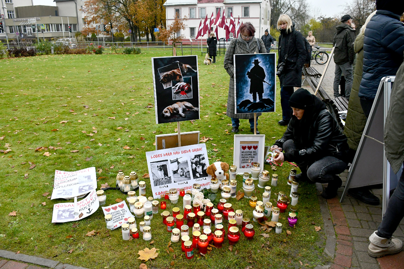 Sanākušie pie domes ēkas atstāja aizdegtas sveces nošauto suņu piemiņai.