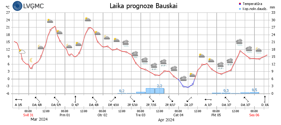 Pūtīs lēns līdz mērens austrumu puses vējš, un teritorijas lielākajā daļā gaiss iesils līdz pat +16, +21 grādam, tādu siltumu sola arī Bauskā. Līdz ar to vairākās novērojumu stacijās varētu tikt uzstādīti jauni 31. marta siltuma rekordi.
