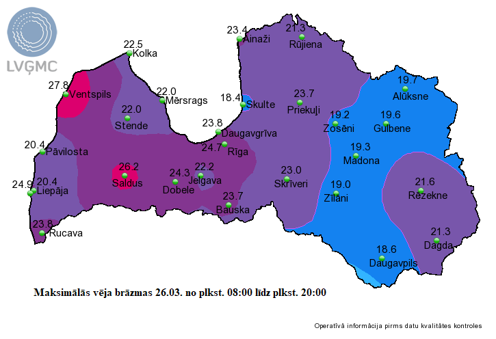 Latvijas Vides, ģeoloģijas un meteoroloģijas centra (LVĢMC) dati liecina, ka sestdien Latviju sasniedza vēja brāzmas 24-25 m/s, vietām tās pieņēmās spēkā līdz pat 28 m/s, nodarot plašus postījumus. Bauskā vējš traucies ar ātrumu 23, 7 metri sekundē.