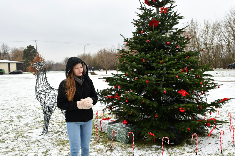 Attēlā – Enija Viktorija Andrejeva pirms sarīkojuma Uzvaras centrā pie svētkiem rotātās eglītes. Foto: Ivars Bogdanovs