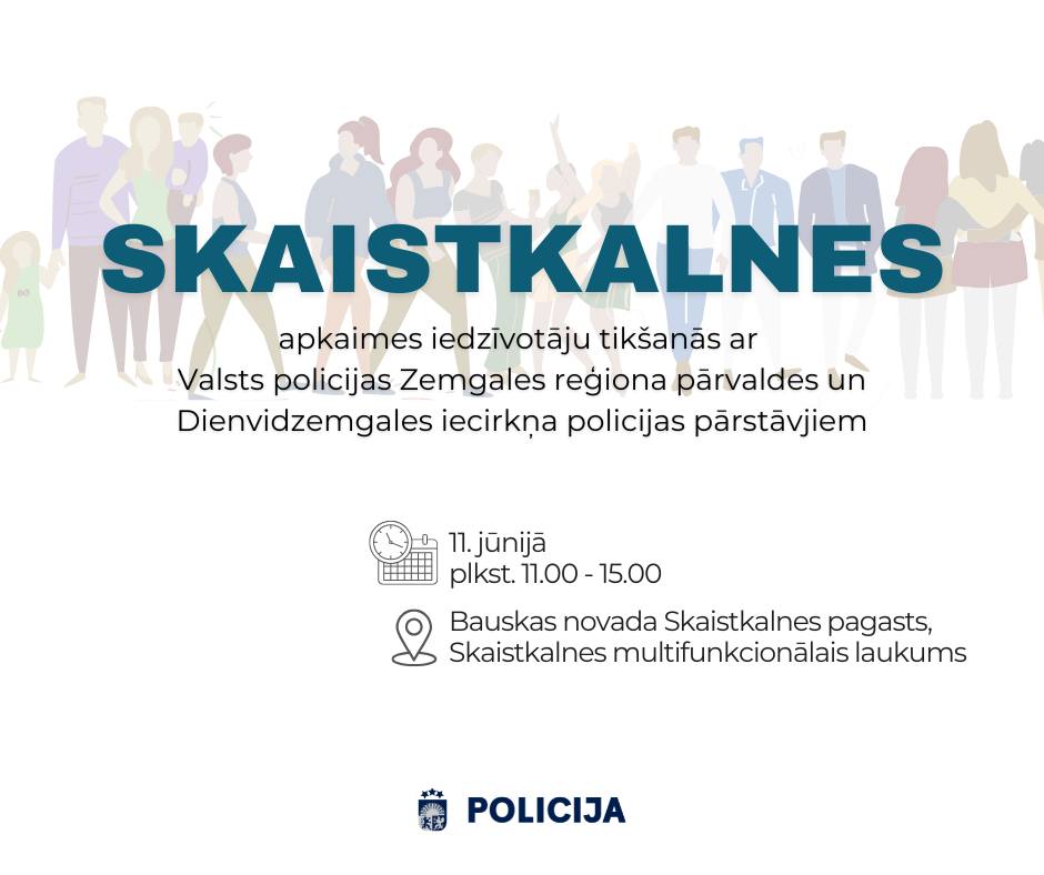 Trešdien, 11.jūnijā, Skaistkalnē norisināsies iedzīvotāju tikšanās ar Valsts policijas Zemgales reģiona pārvaldes un Dienvidzemgales iecirkņa amatpersonām. Šī būs iespēja ikvienam apkaimes iedzīvotājam izteikt savu viedokli, dalīties novērojumos, kā arī kopīgi pārrunāt jautājumus, kas skar sabiedrisko kārtību un drošību, portālu informēja Valsts policijas sabiedrisko attiecību nodaļas vecākā speciāliste Rūta Strautniece-Apaļā.