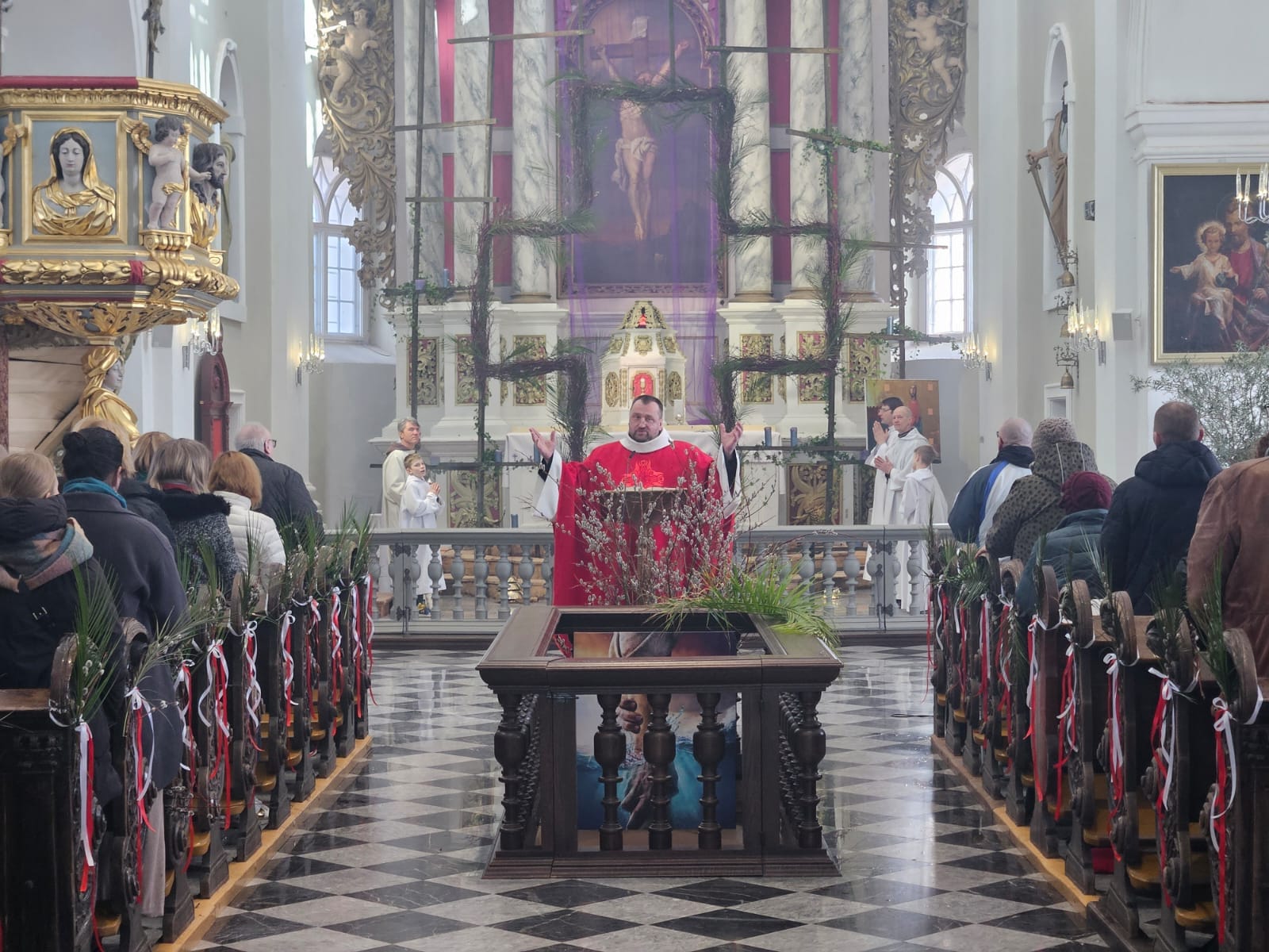 Kad atgriezās atpakaļ dievnamā, tika lasīti svētdienas lasījumi, un evaņģēlijs jau ievadīja Lielās nedēļas notikumos, sākot ar Jēzus svaidīšanu ar dārgu eļļu, tā jau gatavojot Viņu nāvei, pēdējām vakariņām, Jūdas nodevību, Kristus apcietināšanu, pratināšanu, notiesāšanu, šaustīšanu, krustā sišanu un nāvi. Šo brīdi baznīcā piemin ar nomešanos ceļos un klusuma brīdi. Tālāk sekoja sprediķis, ko teica beļģu misionārs Ž. Bastēns, apcerot tā laika notikumus un to nozīmi mūsdienās, kas katram ticīgajam ļauj atbrīvoties no grēku nastas un dzīvot laimīgu dzīvi.